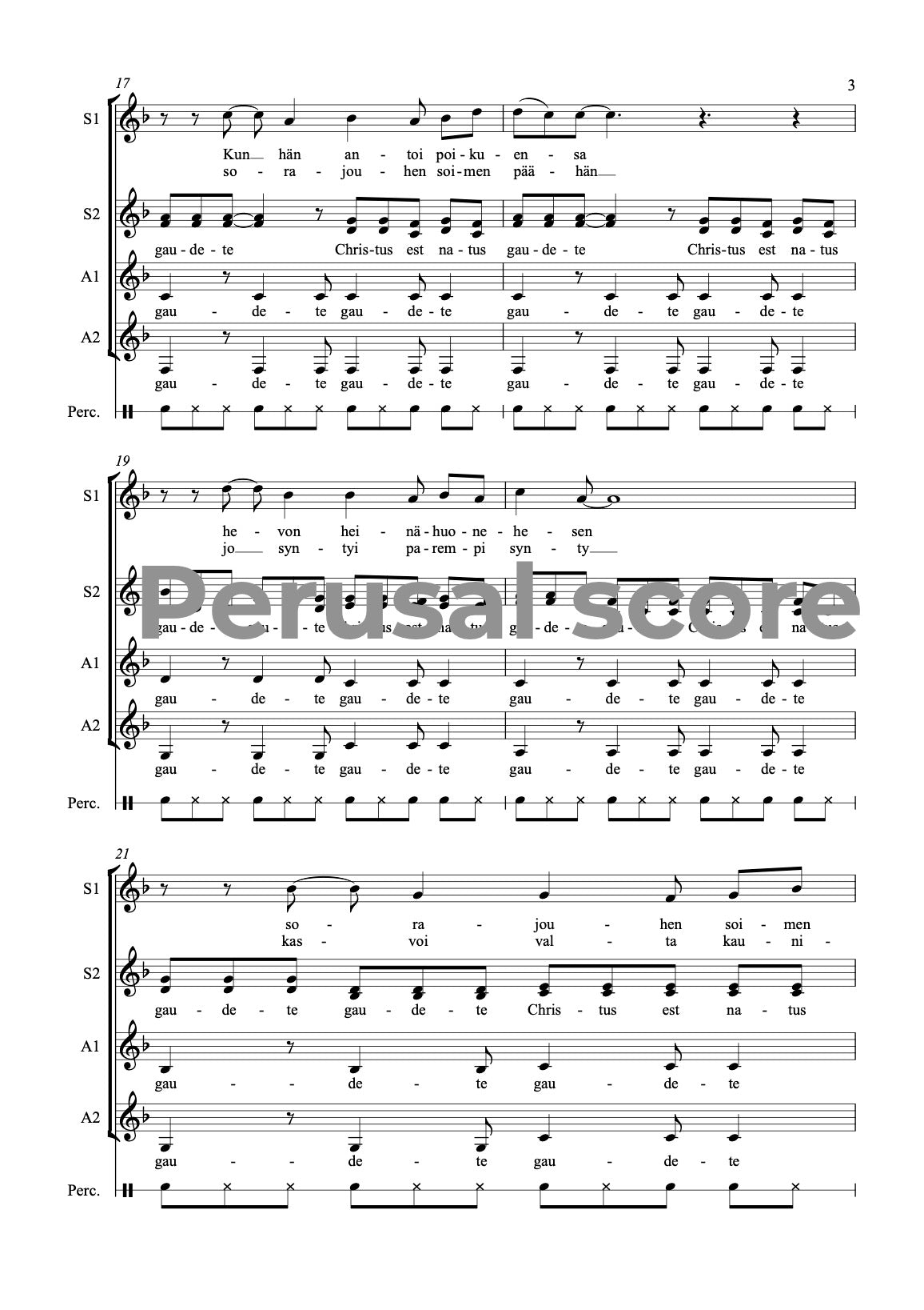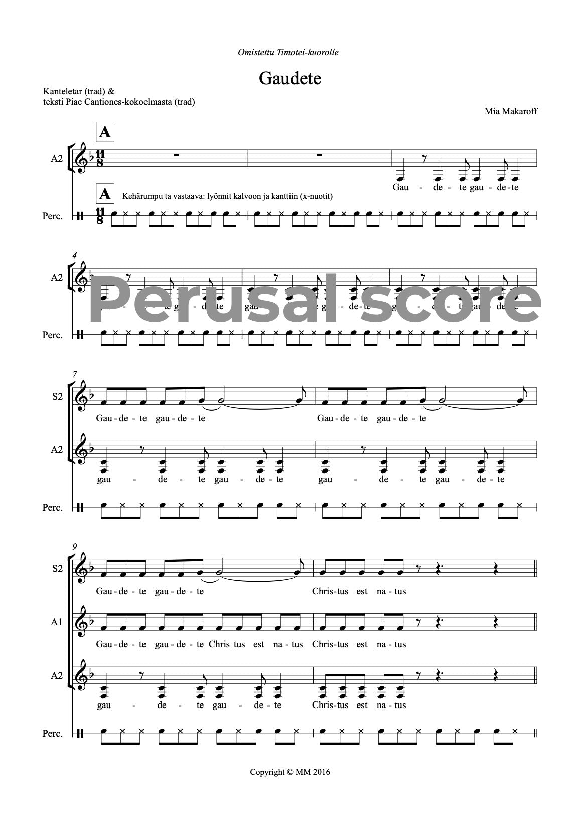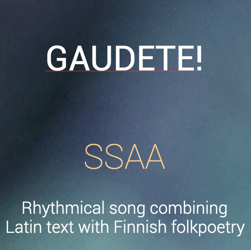 This SSAA song for a female choir and a hand drum is suitable for Christmas concerts; the Finnish text is from Kanteletar (folk poetry) and the Latin text from Piae Cantiones, an old Christian hymn collection. The rhythmic pulse 11/8 gives a nice challenge but the tonality is easy. The song is dedicated to Timotei female choir.