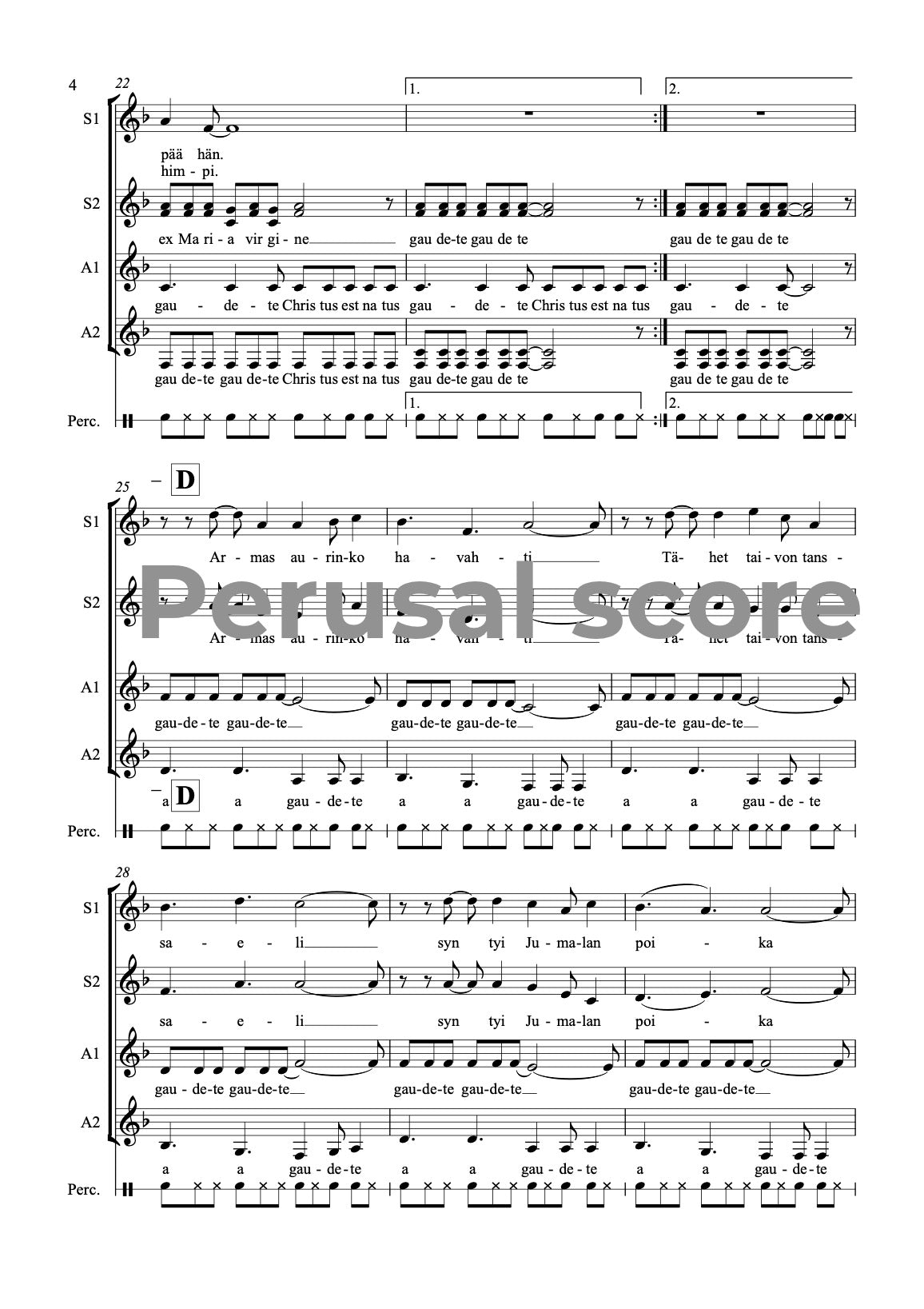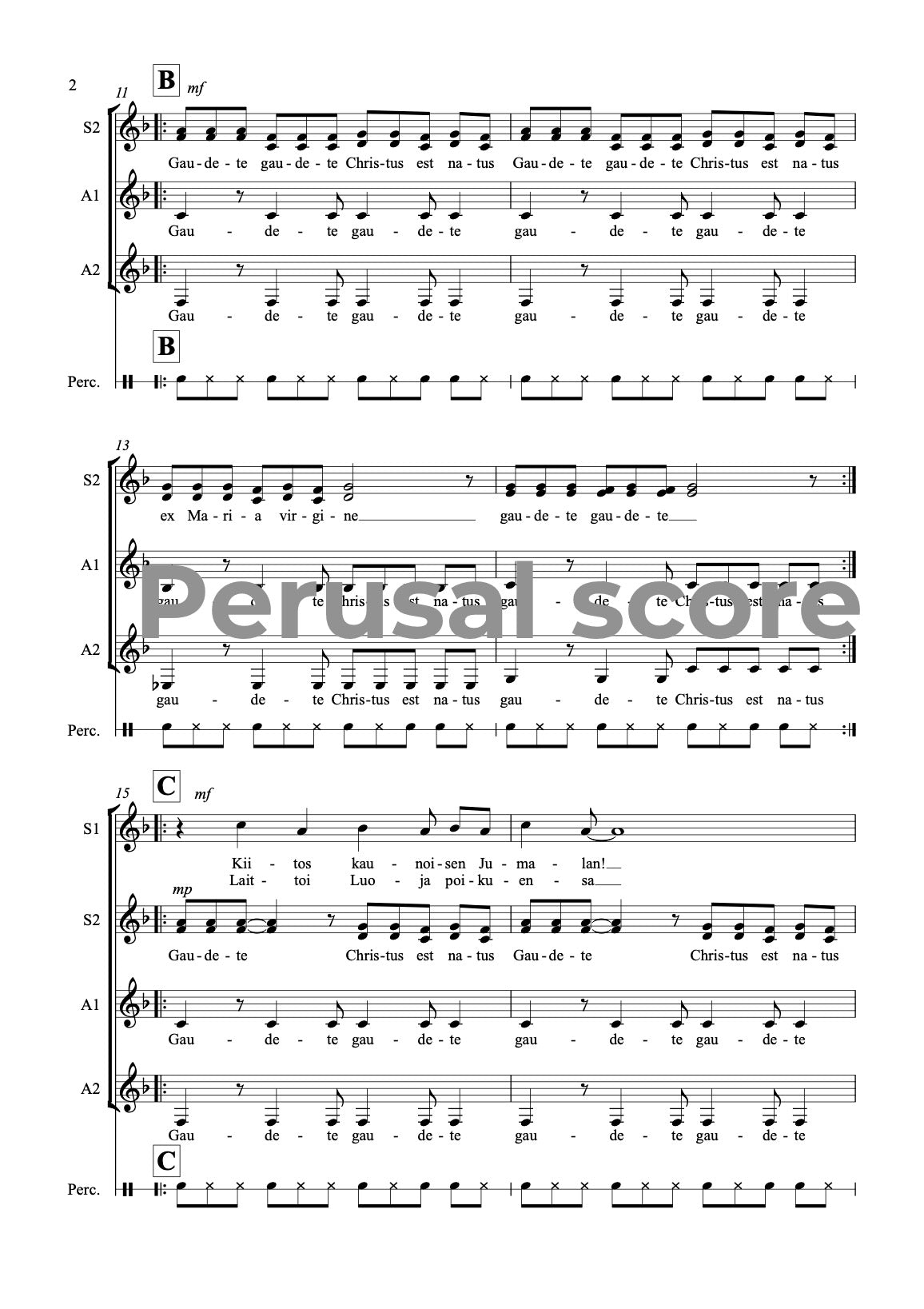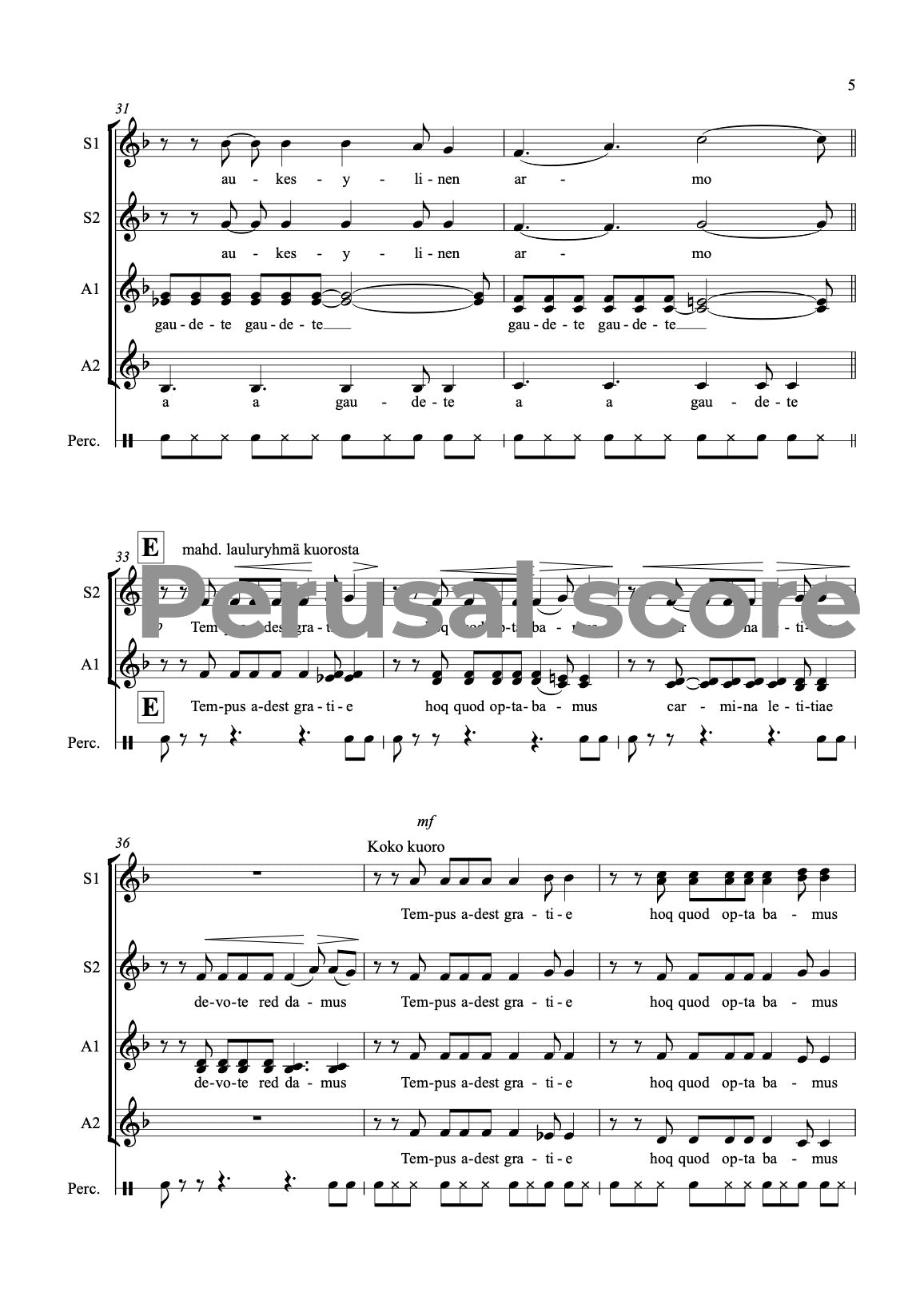 This SSAA song for a female choir and a hand drum is suitable for Christmas concerts; the Finnish text is from Kanteletar (folk poetry) and the Latin text from Piae Cantiones, an old Christian hymn collection. The rhythmic pulse 11/8 gives a nice challenge but the tonality is easy. The song is dedicated to Timotei female choir.
