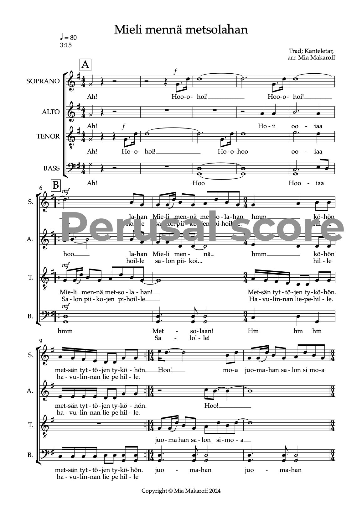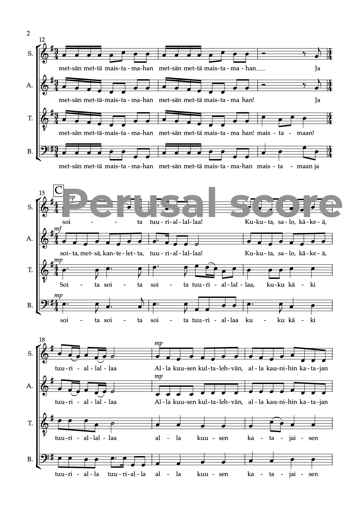 This song is a combination of Finnish traditional melodies. The singers want to go into the forest and they ask the spirit of the forest to give them good luck with hunting. This arrangement was originally written for Vivace Chamber choir to be combined with folk dance choreography.