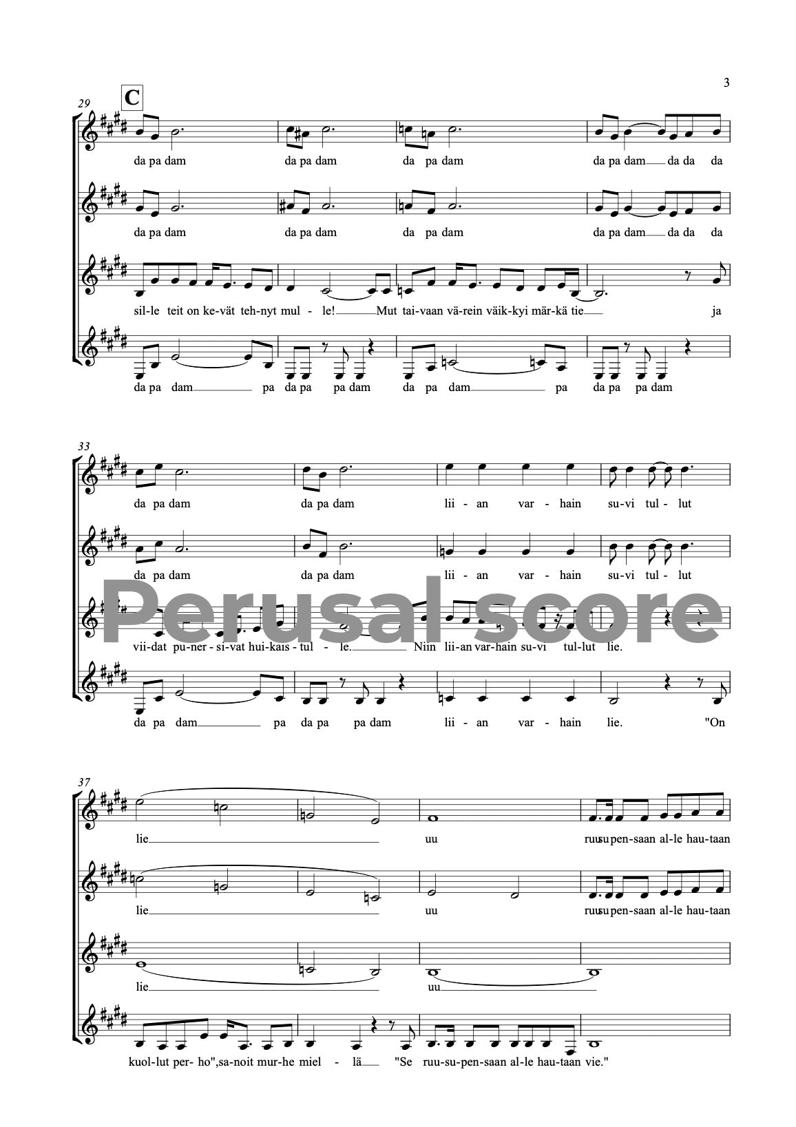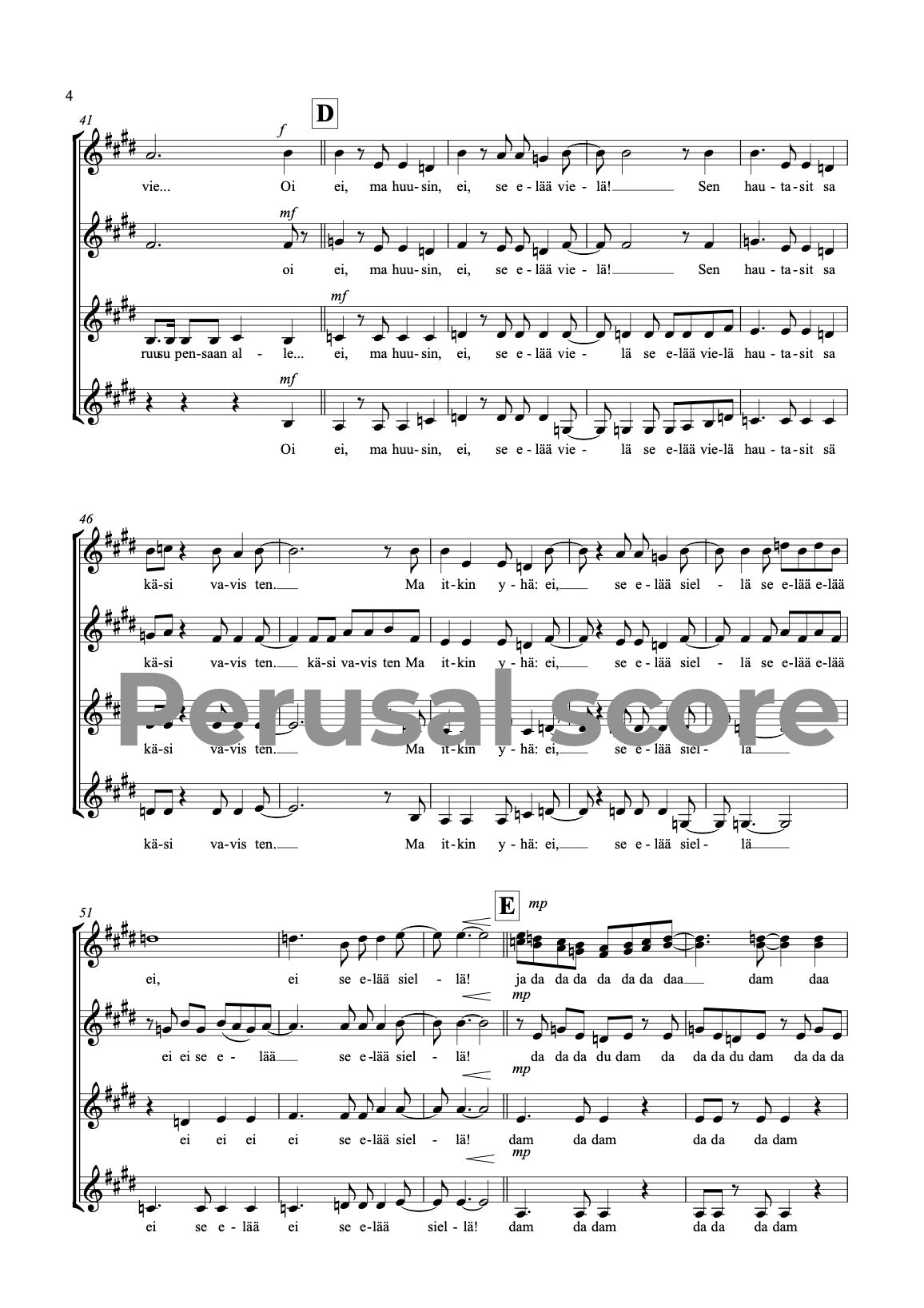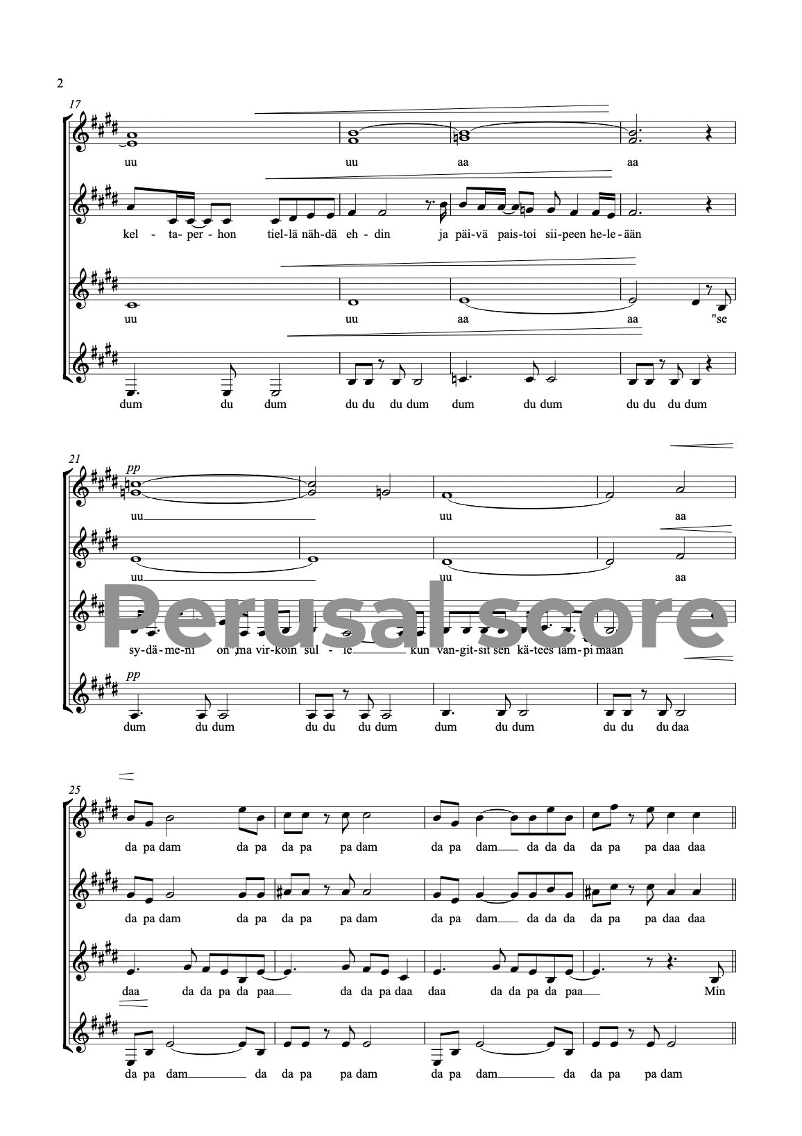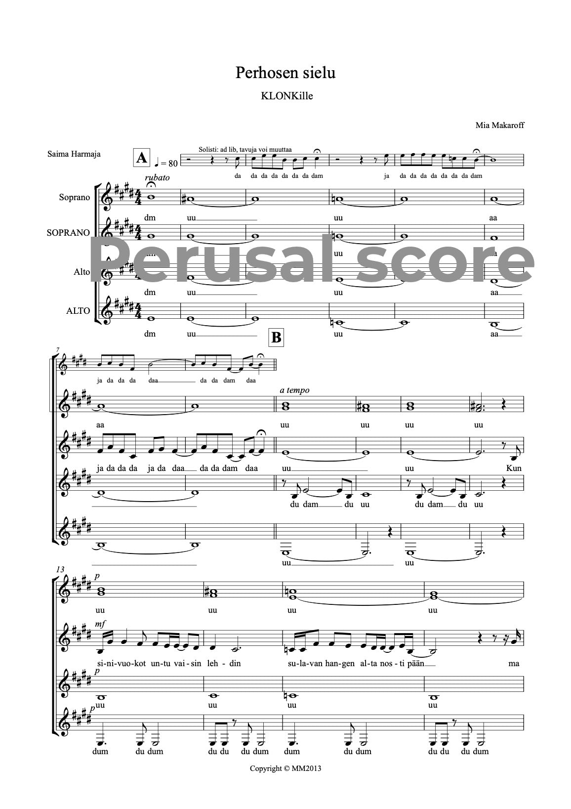 Saima Harmajan herkässä runossa on kevään herkkää taikaa ja riipivyyttä. Klemettiopiston naiskuoron tilaussävellys syntyi vuonna 2013. Teoksen esittäminen vaatii matalia kakkosalttoja, sillä alin ääni on pieni e!