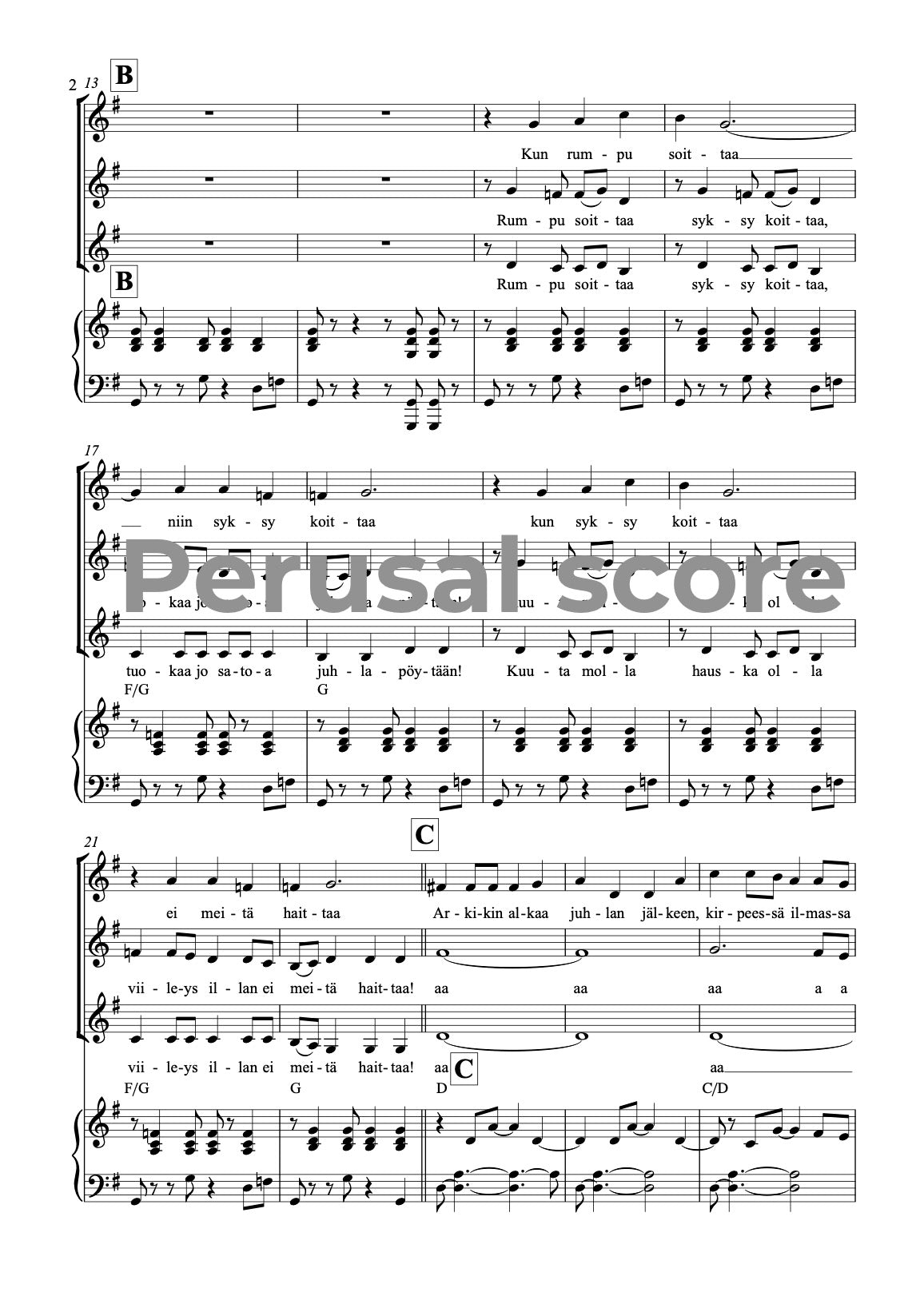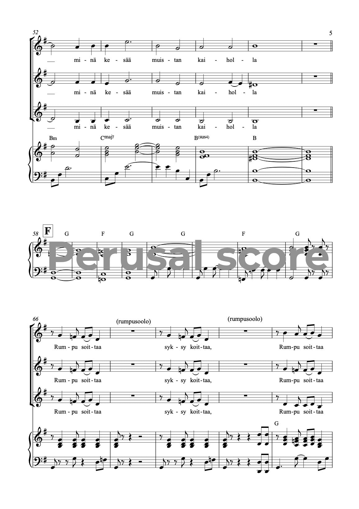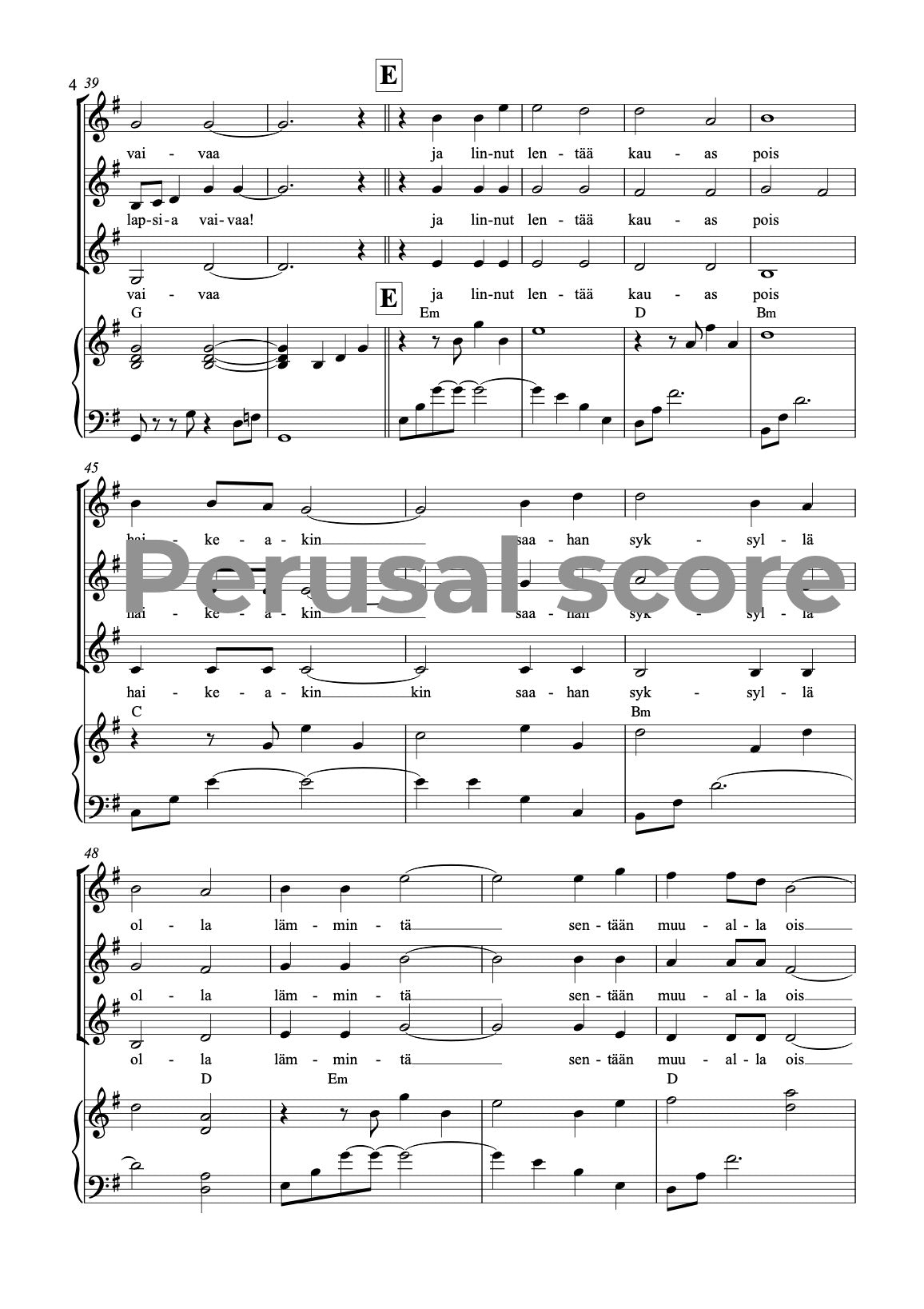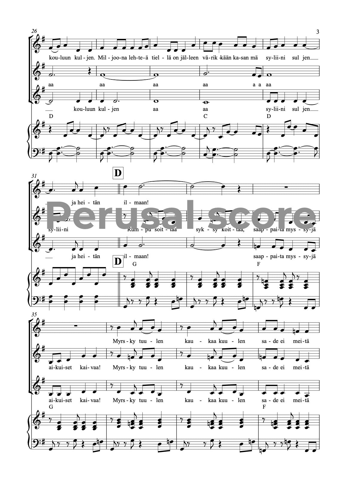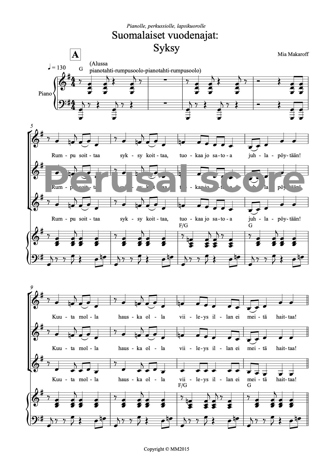 Music and lyrics: Mia Makaroff. This song is easy - medium difficult song for children choirs. This song is a part of a song cycle SUOMALAISET VUODENAJAT (FINNISH SEASONS) with parts 1. Talvi (Winter) 2. Kevät (Spring) 3. Kesä (Summer) and 4. Syksy (Autumn). Text is in Finnish.